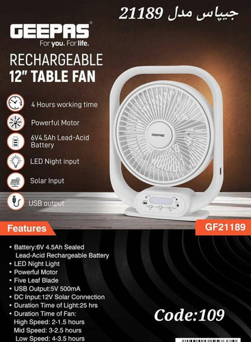 پنکه 8 اینچی قابل شارژ با نور LED جیپاس مدل GF21162ناموجود